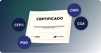 Você precisa tirar um certificado de conhecimento para trabalhar com investimentos, seja na XP, no Grupo Primo ou em qualquer outra instituição. Assessores de investimento precisam passar na prova da Ancord e consultores de investimento devem passar na prova do CEA. Os alunos do MBA poderão escolher um curso preparatório gratuito da TopInvest: ou para a prova do CEA ou para a prova da Ancord. Caso deseje adquirir qualquer outro preparatório da TopInvest - como CFP®, CNPI, CGA, PQO - os alunos terão 50% de desconto na TopInvest.
